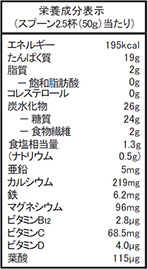 ■1日当たりの摂取目安量:1日当たり50g(専用スプーン2.5杯)を目安にお召し上がりください。